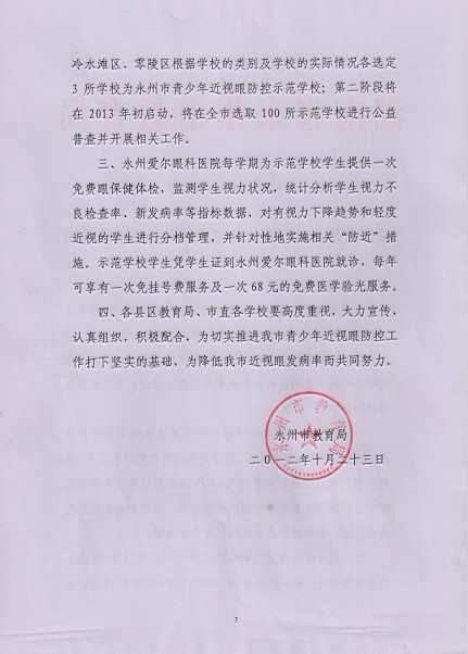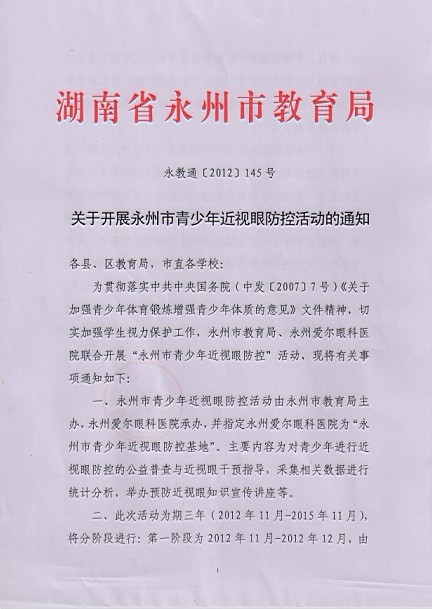 为贯彻落实中共中央国务院(中发[2007]7号)《关于加强青少年体育锻炼增强青少年体质的意见》文件精神,切实加强学生视力保护工作,永州市教育局、永州爱尔眼科医院联合开展“永州市青少年近视眼防控”活动,现将有关事项通知如下:
