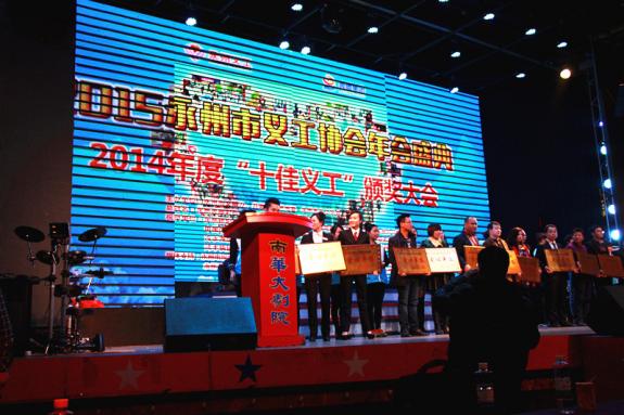 2月7日,2015永州市义工协会年会庆典塈2014年度十佳义工、优秀义工、特殊贡献奖表彰大会在冷水滩区南华大酒店举行,市委常委、宣传部长石艳萍,市政府正厅级干部戴菊芳,老领导李续荣等17家市级单位领导出席活动并为荣获2014年永州“十佳义工”“优秀义工”“特殊贡献奖”及2014年度爱心单位,为永州爱尔眼科医院及其它单位颁奖。