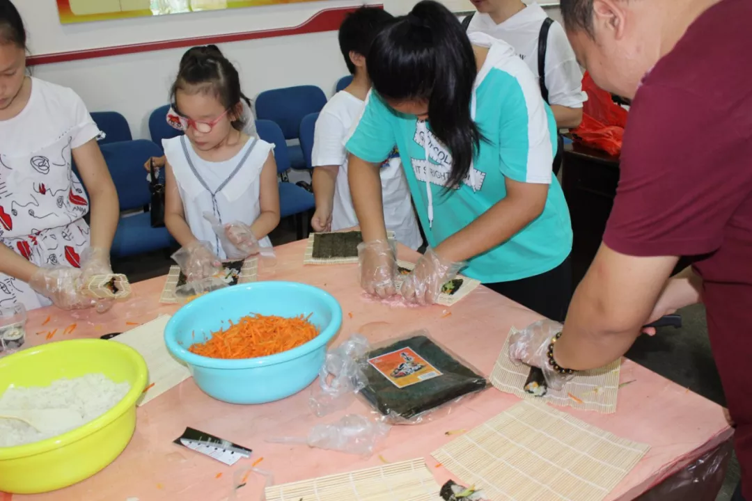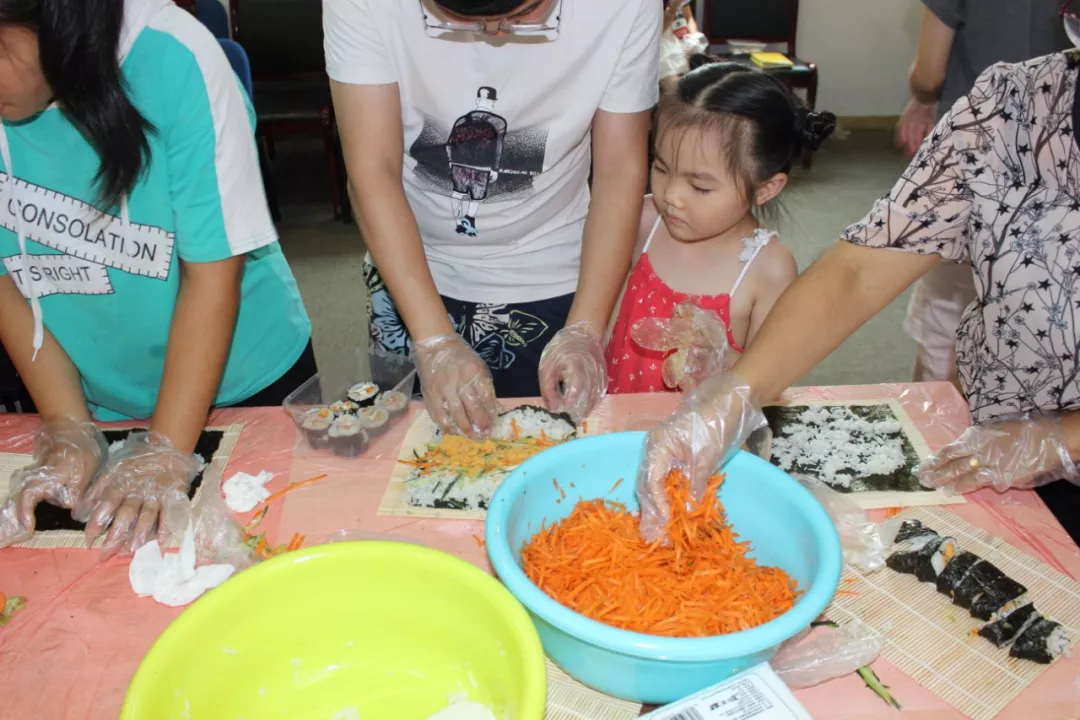 小朋友们从手法略为生疏、食材拿捏不太准确、程序有些错乱开始,经过几次“磨练”,大家很快“进入了角色”,手法愈加纯熟,做出的包饭形态愈加优美,味道愈加鲜美,一个个俨然成为专业级别。看着一盒盒美味的成果,欢乐的笑声一阵接一阵从会议室传出。
