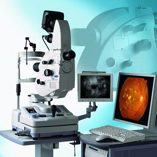 TOPCON(托普康)TRC-50EX眼底荧光造影。可进行眼底彩照,眼底荧光血管造影(FFA)和脉络造影(ICG)。可以动态观察眼底的血液循环状态,并且是眼底镜所不能发现的。主要用于以下疾病的诊断:黄斑出血、黄斑裂孔、黄斑变性、视神经炎、视神经水肿、眼底出血、眼底血管瘤、中央或分支静脉或动脉阻塞、网脱、中浆、中渗、Eales病、Coats病、糖网等各种眼底病疾病。