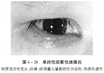 1、起病急,结膜充血,表面大量黏液脓性或脓性分泌物(图4 -28)。严重感染病例可形成假膜,称假膜性结膜炎。