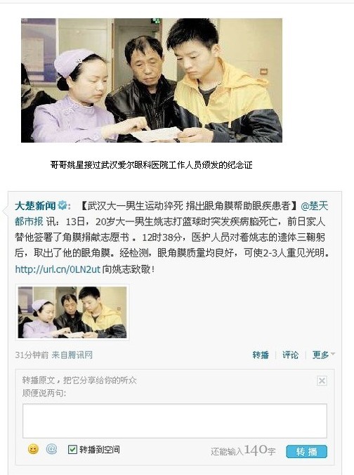 3月13日,中南财经政法大学武汉学院大一男生姚志打篮球时突发疾病脑死亡,前日家人替他签署了角膜捐献志愿书(本报昨日A02版报道)。