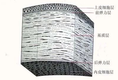 我们先来看看角膜,它总共分为5层,从外到眼球内分别是:上皮细胞层、前弹力层、基质层、后弹力层、内皮细胞层。